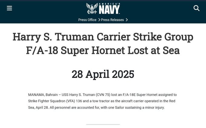 Згідно зі звітом, 28 квітня за місцевим часом винищувач F/A-18E "Super Hornet" та його палубний тягач на американському авіаносці "Гаррі Трумен" у Червоному морі "випадково впали в море".