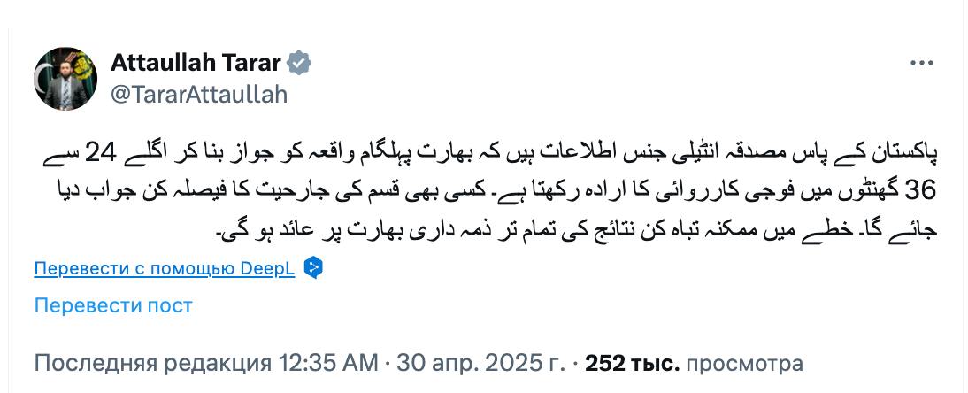 Міністр інформації та телерадіомовлення Пакистану Аттаулла Тарар повідомив, що Індія розпочне війну найближчої доби.