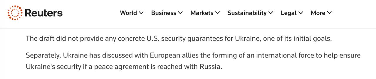 Пізніше видання Reuters підтвердило наше припущення, що угода не має гарантій безпеки для України. Видання нагадує, що саме такі гарантії були однією з початкових цілей угоди для України.