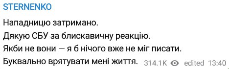 При цьому він зазначив, що нападницею була жінка, яку вже затримала Служба безпеки України.
