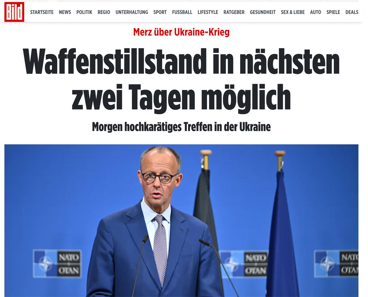 Bild пише, що новий канцлер ФРН поспілкувався з президентом США Дональдом Трампом, зустрівся з генеральним секретарем НАТО Марком Рютте, а також відвідав президента Франції Емманюеля Макрона і прем'єр-міністра Польщі Дональда Туска разом з прем'єр-міністром Великобританії ідентично мирним пропозиціям США.