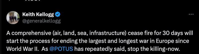 15:48 30-денне припинення вогню стане початком завершення війни в Україні, заявив спецпредставник президента США Кіт Келлог.