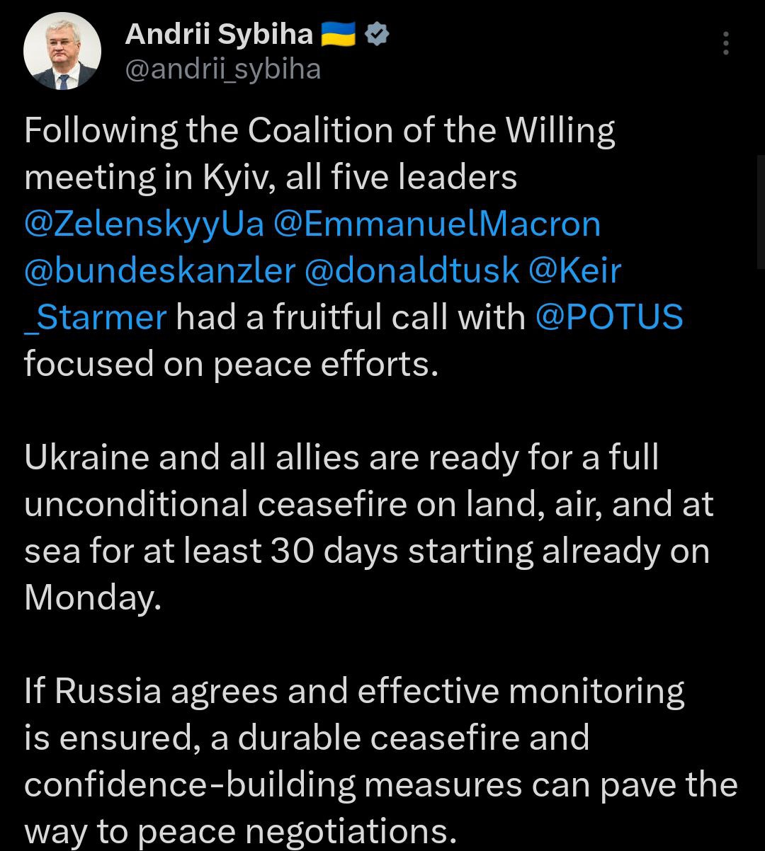 Україна та всі союзники готові до повного безумовного припинення вогню на суші, у повітрі та морі щонайменше на 30 днів, починаючи вже з понеділка.