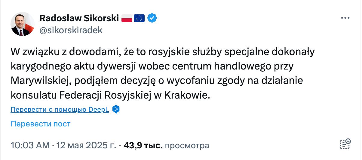 "У зв'язку з доказами того, що російські спецслужби вчинили ганебний акт диверсії проти торгового центру на вулиці Маривільській, я ухвалив рішення про відкликання згоди на діяльність консульства Російської Федерації у Кракові", - написав сьогодні у соцмережі Сікорський.