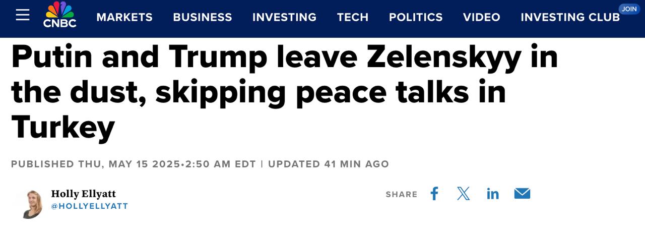 У той же час телеканал CNBC заявляє, що Путін і Трамп "залишають Зеленського без роботи, проігнорувавши мирні переговори в Туреччині".