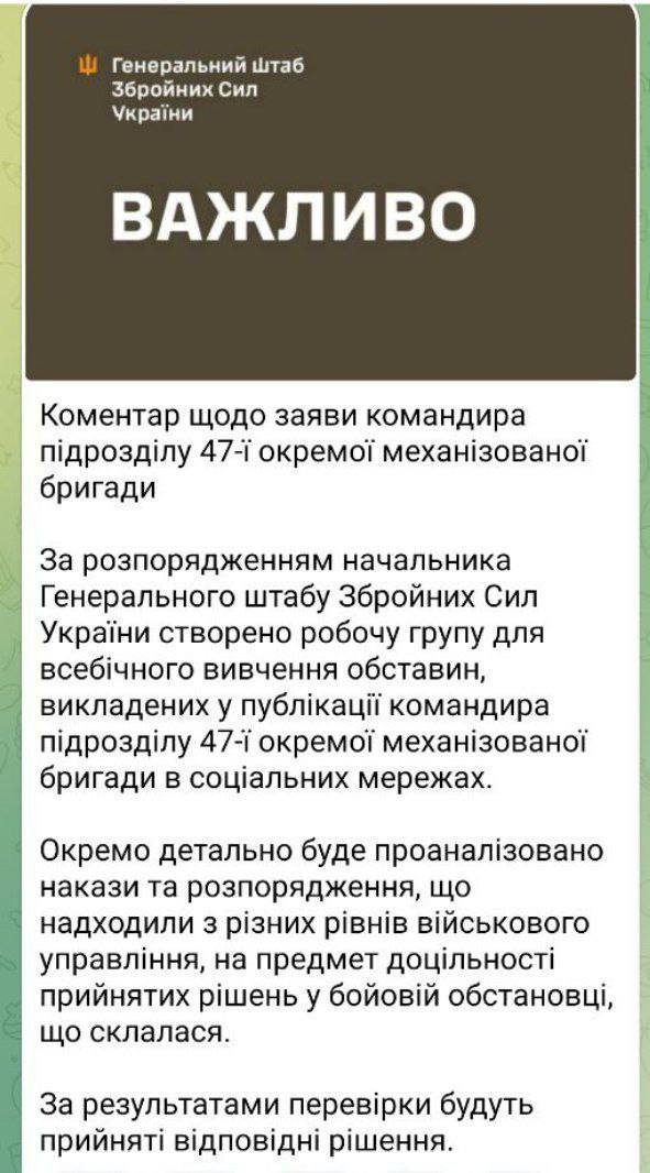"За розпорядженням начальника Генерального штабу Збройних Сил України створено робочу групу для всебічного вивчення обставин, викладених у публікації командира підрозділу 47-ї окремої механізованої бригади у соціальних мережах", - заявили у прес-службі.