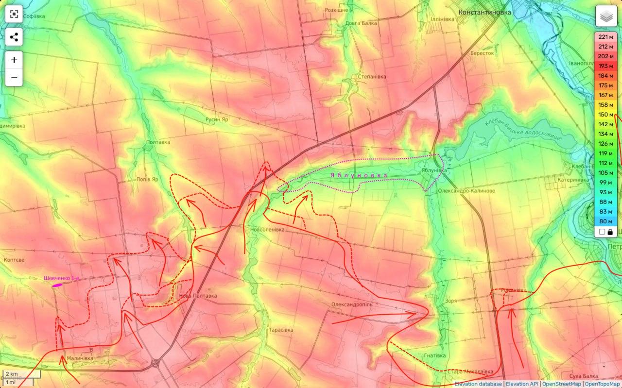 За словами українського бійця з позивним Мучною, напередодні росіяни фактично зайняли два сусідні села: Малинівку і Новоєленівку. окраїни Шевченка Перше. Українські карти цього не підтверджують.