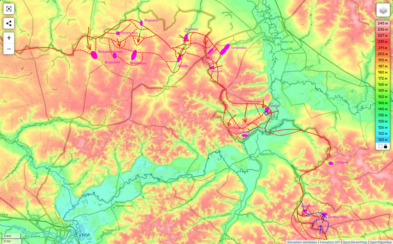 Український військовий експерт Костянтин Машовець пише, що російські атаки в Сумській області активізувалися за останні кілька днів Росіяни посилили штурми за напрямками Веселівка – Водологи, а також Журавка – Біловоди, "очевидно, з метою просування у південному напрямку та виходу на кордон Новомиколаївка – Яблунів".