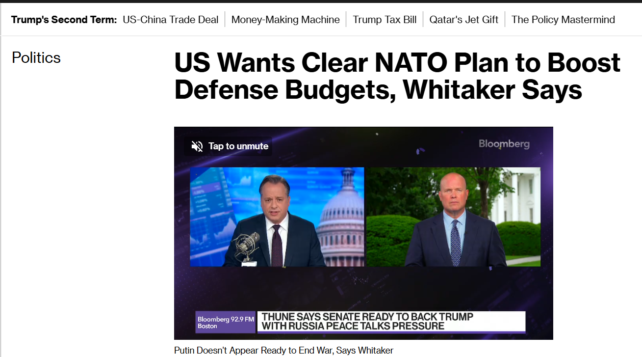 Постійний представник США в НАТО Меттью Уітакер заявив, що Альянсу необхідно надати чіткі кроки для досягнення цільового показника видатків на оборону у розмірі 5% від обсягу виробництва з упором на "жорсткі оборонні можливості".