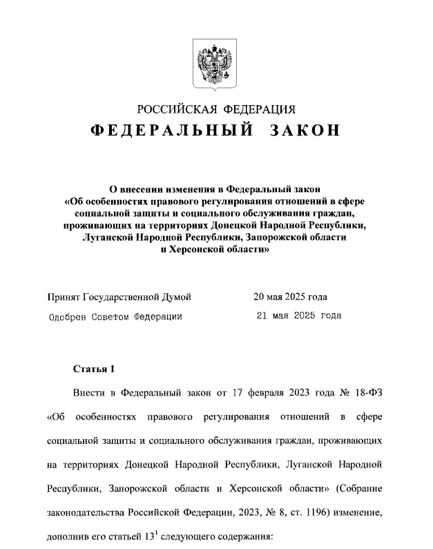 Документ вносить зміни до закону про особливості правового регулювання відносин у сфері соціального захисту та соціального обслуговування громадян, які проживають на захоплених територіях Донецької, Луганської, Запорізької та Херсонської областей.