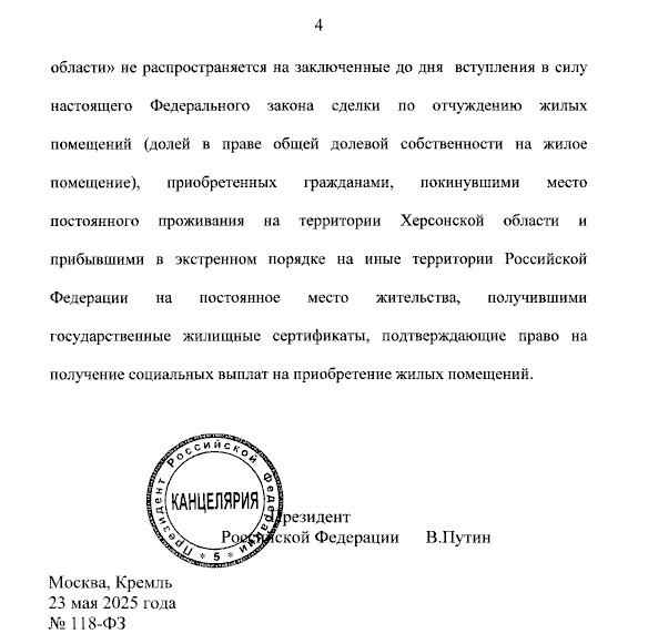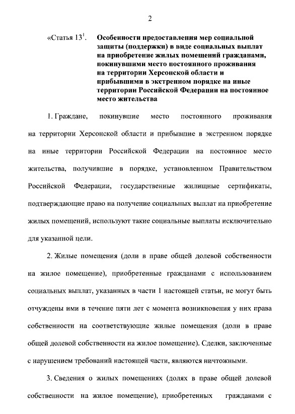 Відповідно до нього громадяни, які залишили місце проживання в Херсоні або Херсонській області та прибули в екстреному порядку на інші території РФ для подальшого проживання, мають право на отримання соціальної виплати для придбання житла на підставі ДЖС. Проте, як зазначено у супровідних матеріалах, було виявлено випадки використання мешканцями Херсона та частини Херсонської області сертифікатів для подальшого продажу одержаного житла.
