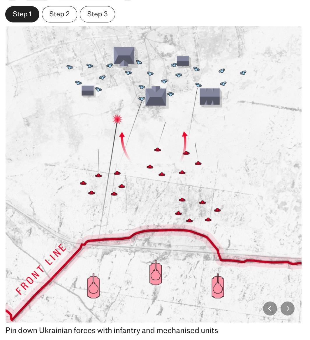 Тактика зводиться до того, що спочатку ведеться наземна атака, щоб скувати ЗСУ та змусити їх зайняти позиції, а не маневрувати.