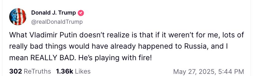"Володимир Путін не розуміє, що якби не я, з Росією вже сталося б багато справді поганих речей - і я маю на увазі дуже поганих. Він грає з вогнем!" - заявив Трамп.