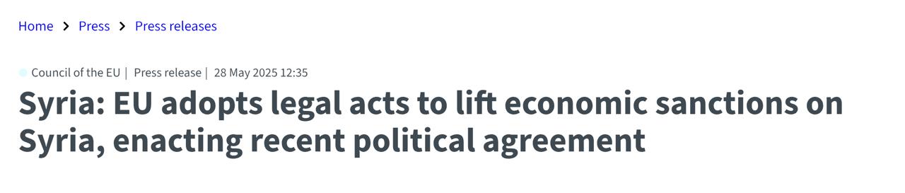 "Рада ЄС прийняла юридичні документи про відміну всіх економічних обмежувальних заходів проти Сирії, за винятком тих, що ґрунтуються на міркуваннях безпеки (маються на увазі антитерористичні заходи - Ред. ). Прийняття формалізує політичне рішення, оголошене 20 травня 2025 року, і спрямоване на підтримку інклюзивної, плюралістичної та мирної Сирії", - йдеться у заяві.