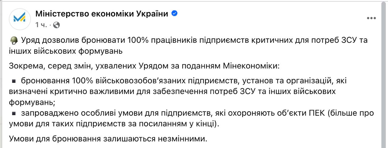 15:45 Підприємства, які є критичними для роботи ЗСУ, тепер зможуть бронювати до 100% працівників, уточнює Мінекономіки рішення Кабміну.