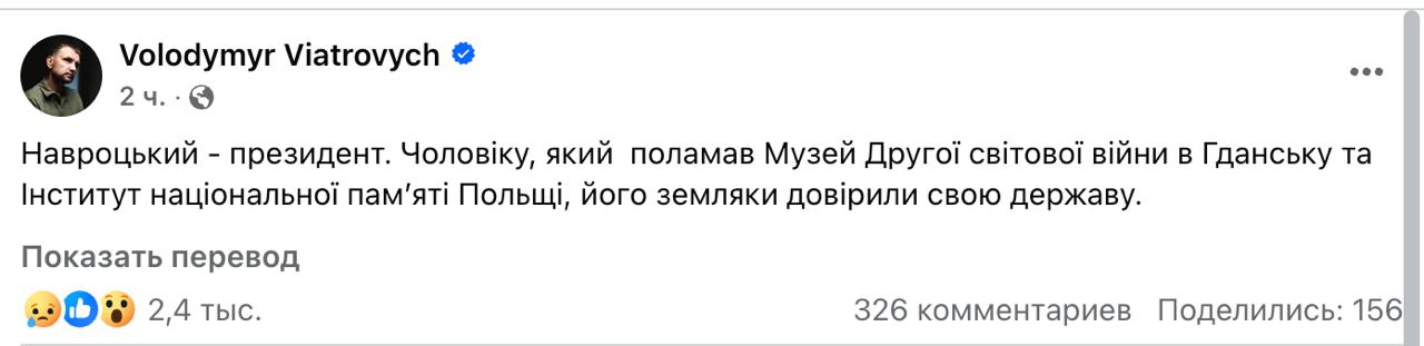 Народний депутат України Володимир В'ятрович розкритикував "польського В'ятровича" Кароля Навроцького, який переміг на виборах у Польщі.