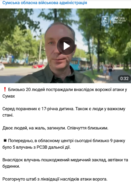 Вранці російські військові обстріляли центр міста Суми із ракетних систем залпового вогню (РСЗВ) дальньої дії. Загинули двоє людей, поранено близько 20 людей.