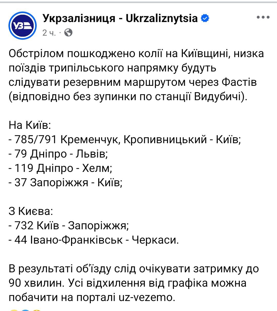 Також пошкоджено шляхи на перегоні в районі станції Видубичі, що викликало зміни у маршрутах низки поїздів Трипільського спрямування.