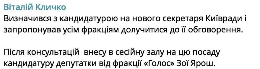 "Визначився з кандидатурою на нового секретаря Київради та запропонував усім фракціям приєднатися до його обговорення. Після консультацій внесу до сесійної зали на цю посаду кандидатуру депутата від фракції "Голос" Зої Ярош", - написав Кличко.