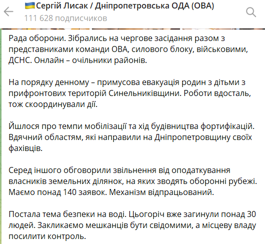 Учора про розширення евакуації також говорили і у Дніпропетровській ОВД. Йшлося про примусову евакуацію сімей з дітьми з прифронтових територій Синельниківського району.