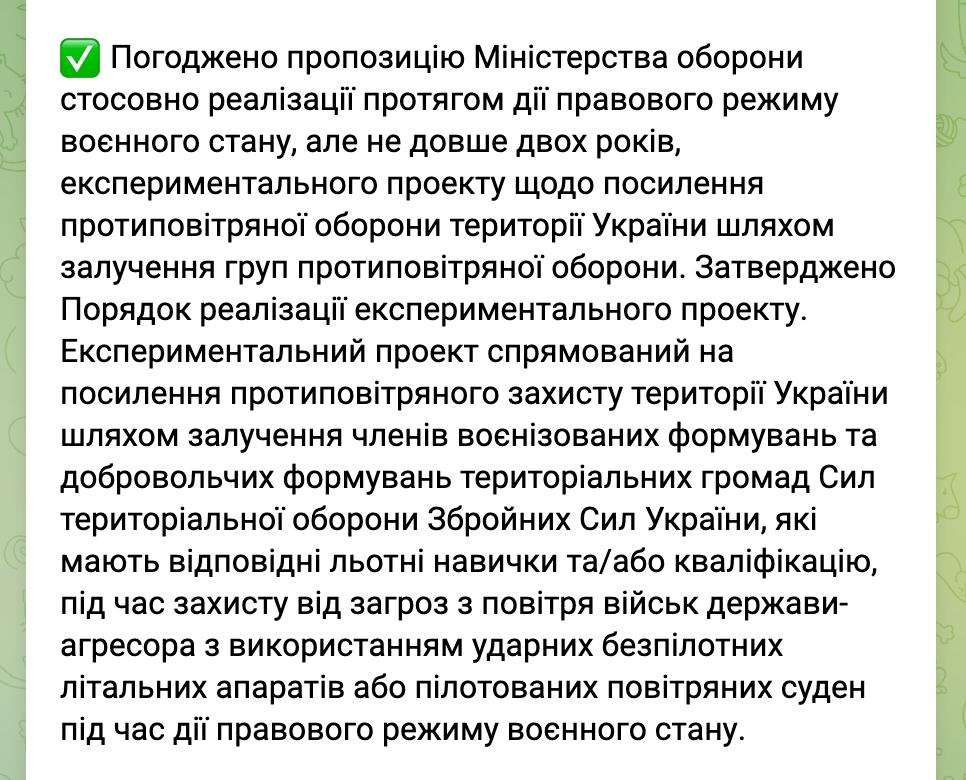 Напередодні Кабмін повідомив, що погодив пропозицію Міноборони щодо запуску "експериментального проєкту" із залученням до ППО "членів воєнізованих формувань та добровольчих формувань територіальних громад Сил територіальної оборони ЗСУ".