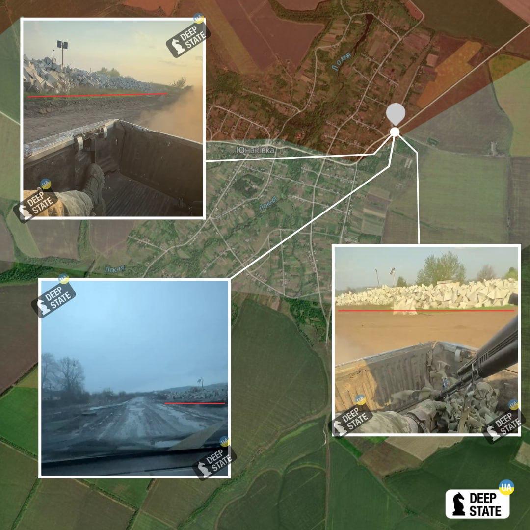 Він публікує фото будівельних матеріалів, які просто лежали з зими в районі Юнаківки та тепер їх зможуть використати для своїх укріплень росіяни.
