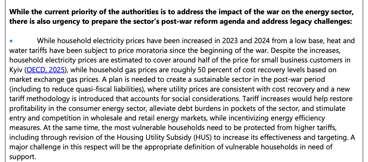 У меморандумі сказано, що незважаючи на підвищення у 2023 та 2024 роках, "ціни на електроенергію для населення становлять близько половини рівня цін для малого бізнесу, тоді як ціни на газ для населення покривають приблизно 50% витрат на основі ринкових цін на газ".