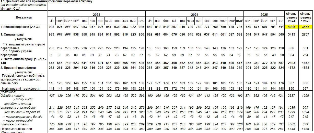 В Україну надходить дедалі менше грошових переказів від приватних осіб. Згідно з новим звітом, у січні-травні 2025 року загальний обсяг таких перерахувань зменшився з $4,1 млрд до $3,5 млрд порівняно з аналогічним періодом 2024 року, тобто на 15%.