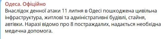 Сьогодні вдень росіяни атакували ударними безпілотниками Одесу. Постраждали 8 людей. Пошкоджено цивільну інфраструктуру, житлові та адміністративні будівлі, стайню, автомобілі.