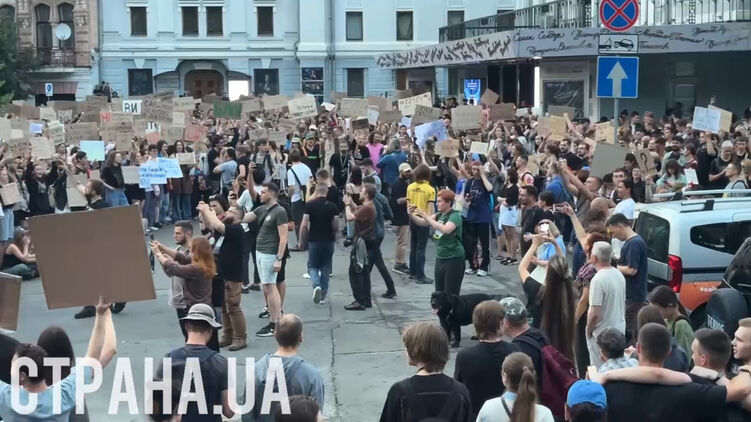 У Києві протестувальники проти закону про урізання повноважень НАБУ та САП скандують "Ганьба!" ("Ганьба!").