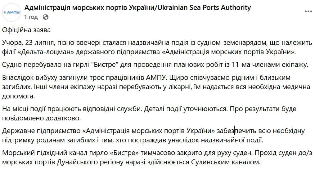Земснаряд підірвався у гирлі "Швидке", де проводив планові роботи. На борту було 11 людей, деякі отримали поранення, повідомляє Адміністрація морських портів.