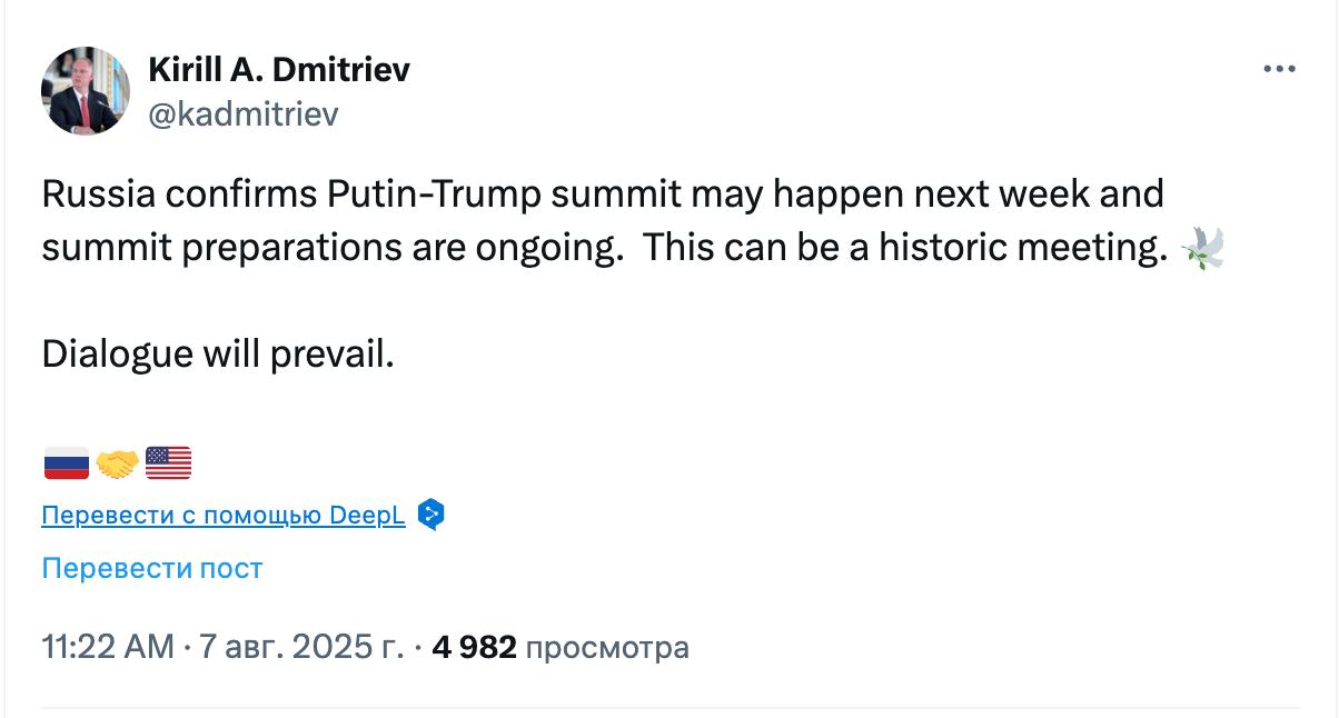 При цьому спецпредставник Кремля Кирило Дмитрієв заявив, що запланована зустріч Путіна та Трампа може стати "історичною".