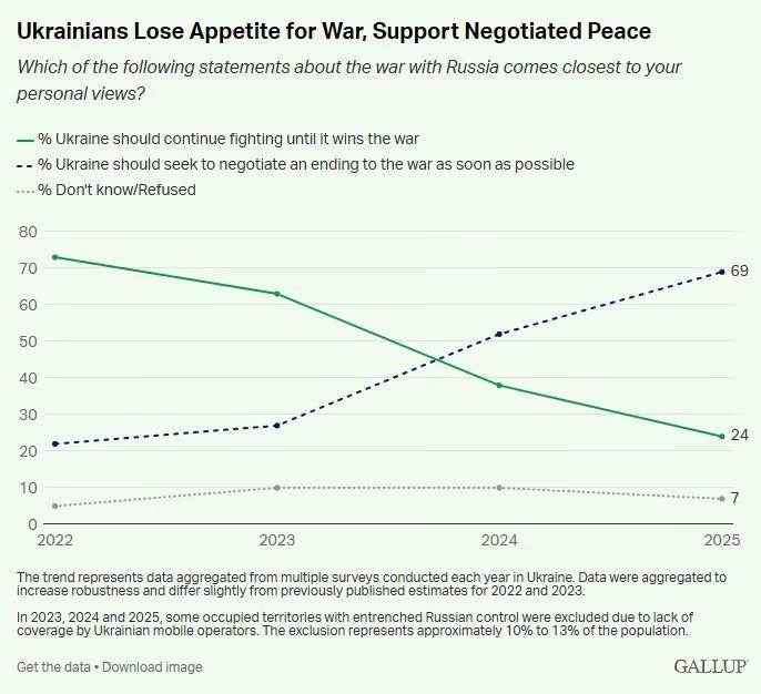 "Через більше трьох років після початку війни підтримка українцями ідеї продовження бойових дій до перемоги досягла нового мінімуму. Згідно з останнім опитуванням Gallup, проведеному в Україні на початку липня, 69% опитаних заявили, що виступають за якнайшвидше припинення війни шляхом переговорів, в той час як 24% висловився до 24%. прес-реліз.