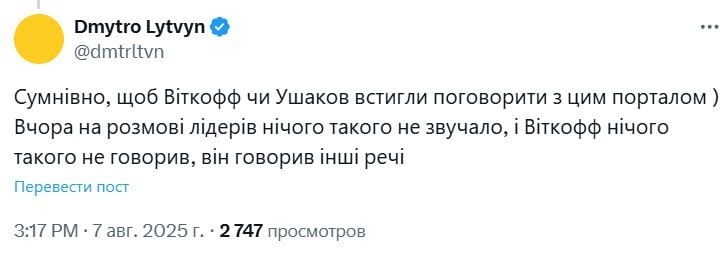 "Сумнівно, щоб Віткофф чи Ушаков встигли поговорити з цим порталом. Учора на розмові лідерів нічого такого не звучало, і Віткофф нічого такого не говорив, він говорив інші речі", - написав радник Зеленського.
