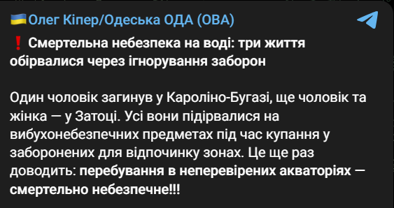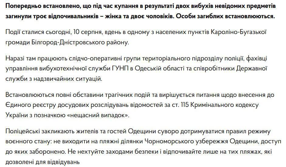 "Попередньо встановлено, що під час купання внаслідок двох вибухів невідомих предметів загинули троє відпочивальників – жінка та двоє чоловіків. Особи загиблих встановлюються", - йдеться у повідомленні.