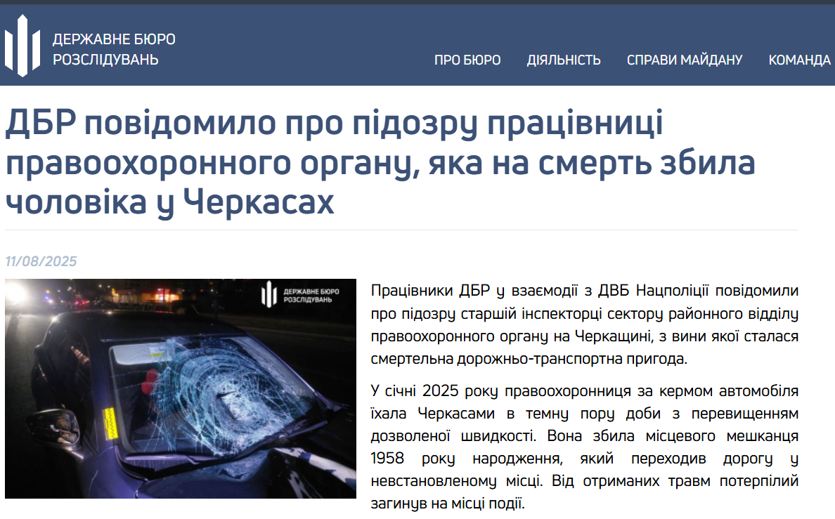 Державне бюро розслідувань повідомило про підозру працівниці правоохоронного органу, яка ще у січні збила на смерть чоловіка у Черкасах.