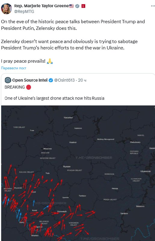 "Напередодні історичних мирних переговорів між президентом Трампом та президентом Путіним Зеленський робить це. Зеленський не хоче миру і, очевидно, намагається саботувати героїчні зусилля президента Трампа щодо припинення війни в Україні", – написала Грін.