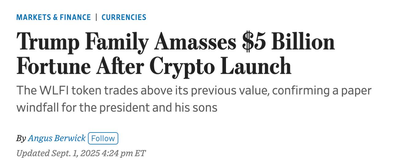 Учора сім'я президента США Дональда Трампа заробила близько п'яти мільярдів доларів на відкритті торгів своєю новою цифровою валютою WLFI. Ймовірно, це був найбільший фінансовий успіх сім'ї президента з моменту його інавгурації.