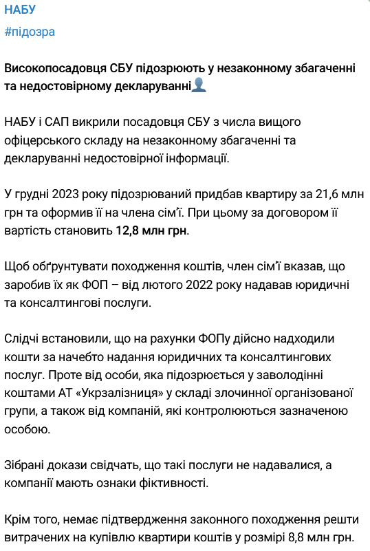 За даними слідства, у грудні 2023 року підозрюваний купив квартиру за 21,6 млн. грн. і оформив її на члена сім'ї. За договором її вартість складає 12,8 млн. грн.