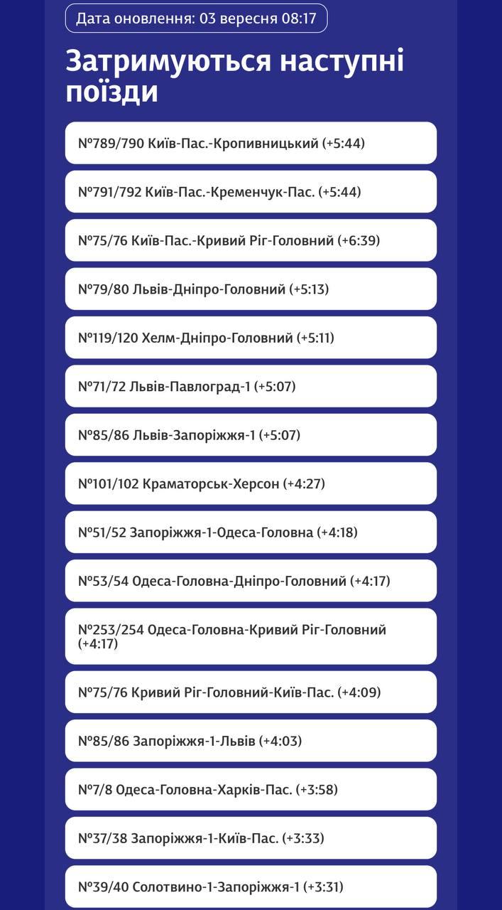 8.34 Затримки понад п'ять годин. Оновлений графік поїздів "Укрзалізниці" після нічного обстрілу.