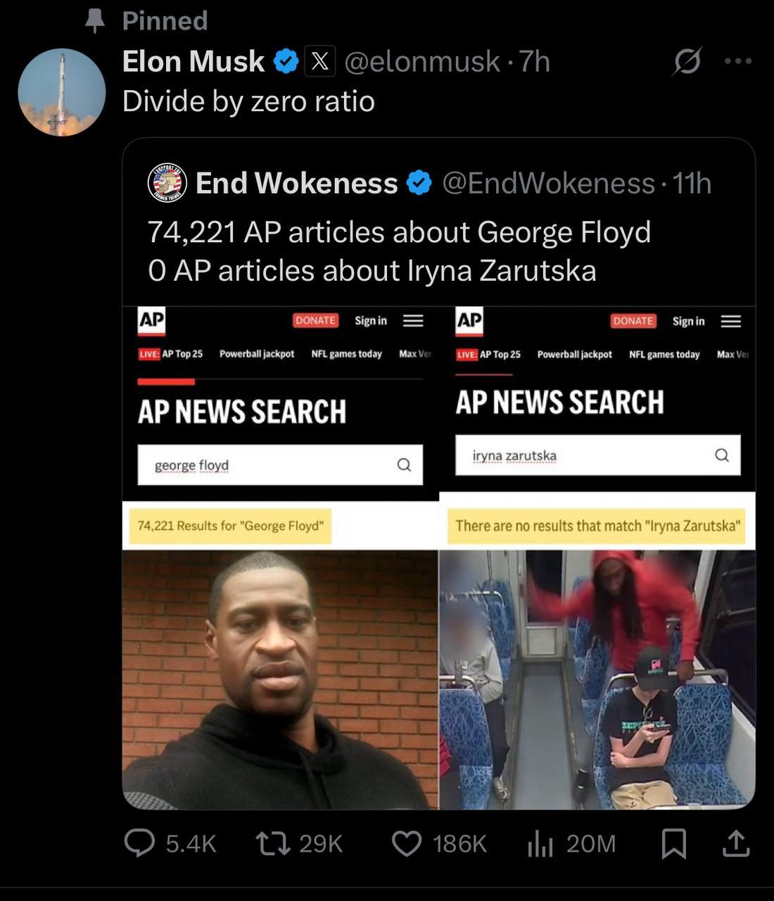 Маск репостнув і закріпив повідомлення про те, що видання Associated Press, орієнтоване на демократів, не написало про вбивство українки, натомість активно висвітлювало вбивство у 2020 році темношкірого чоловіка Джорджа Флойда білим поліцейським.