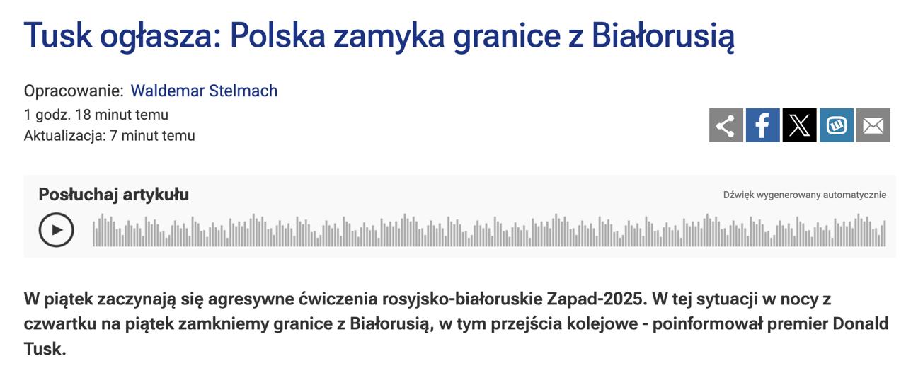 Польща закриває кордон з Білоруссю, включаючи залізничне сполучення, у зв'язку з білорусько-російськими військовими навчаннями "Захід-2025", що стартують у п'ятницю.