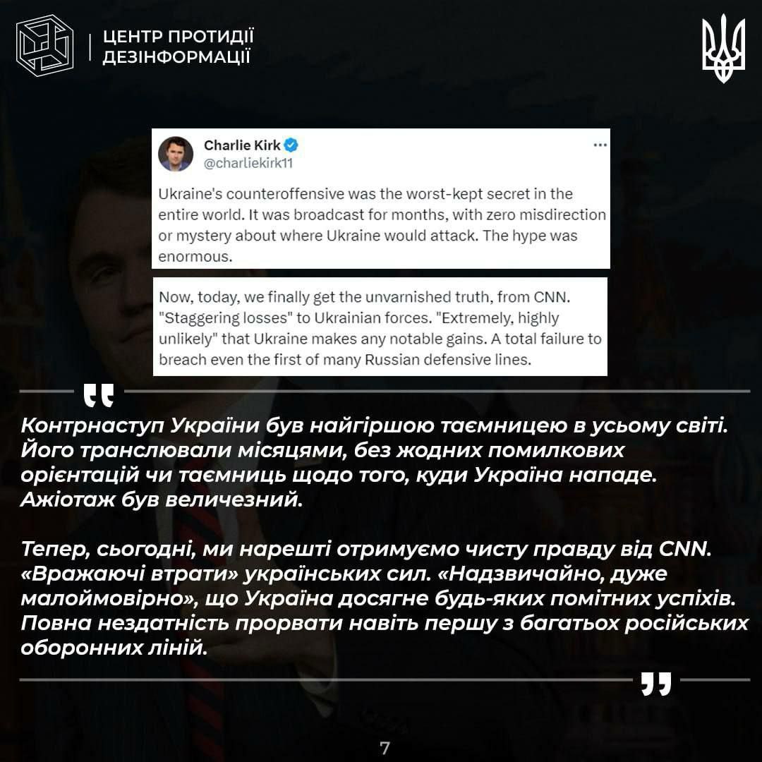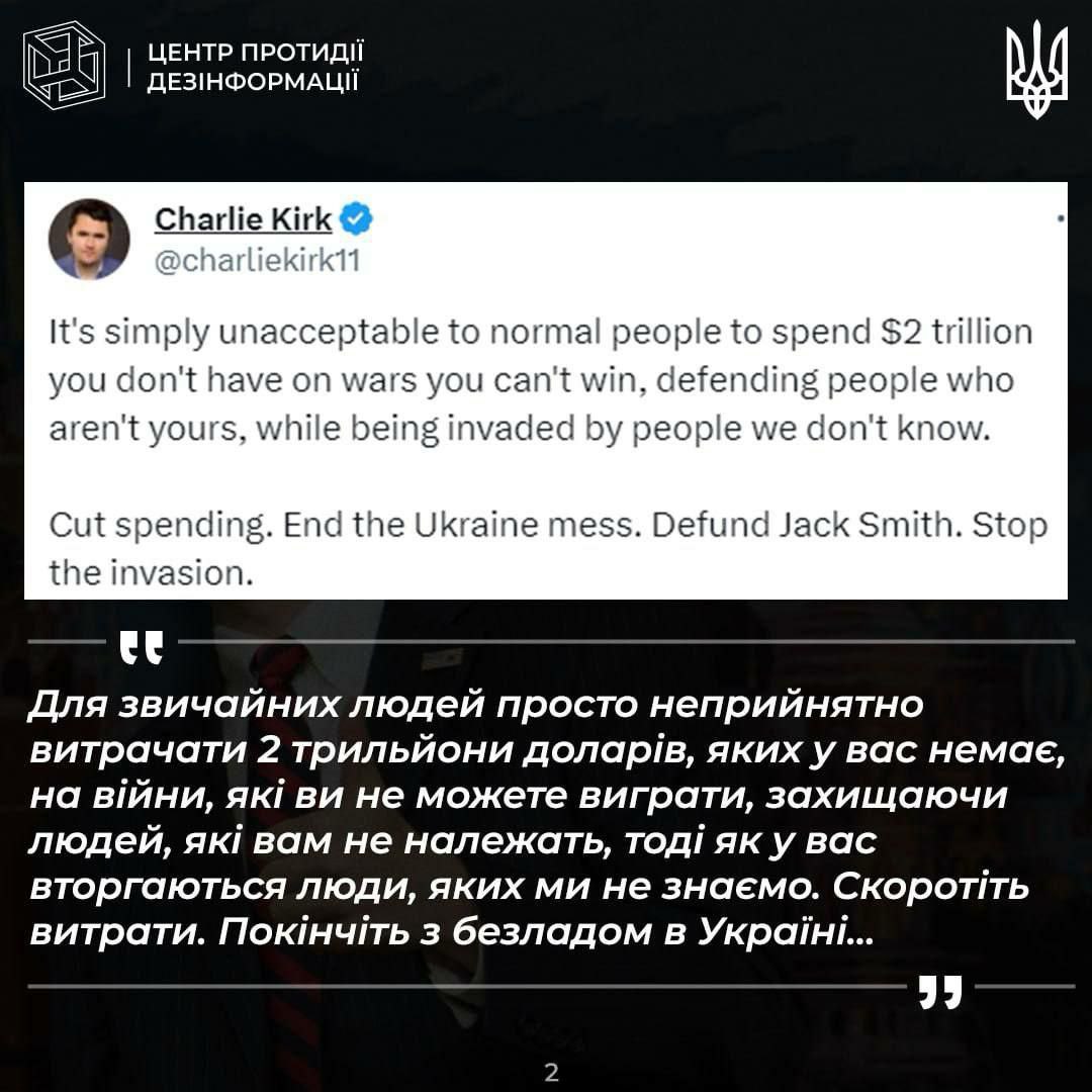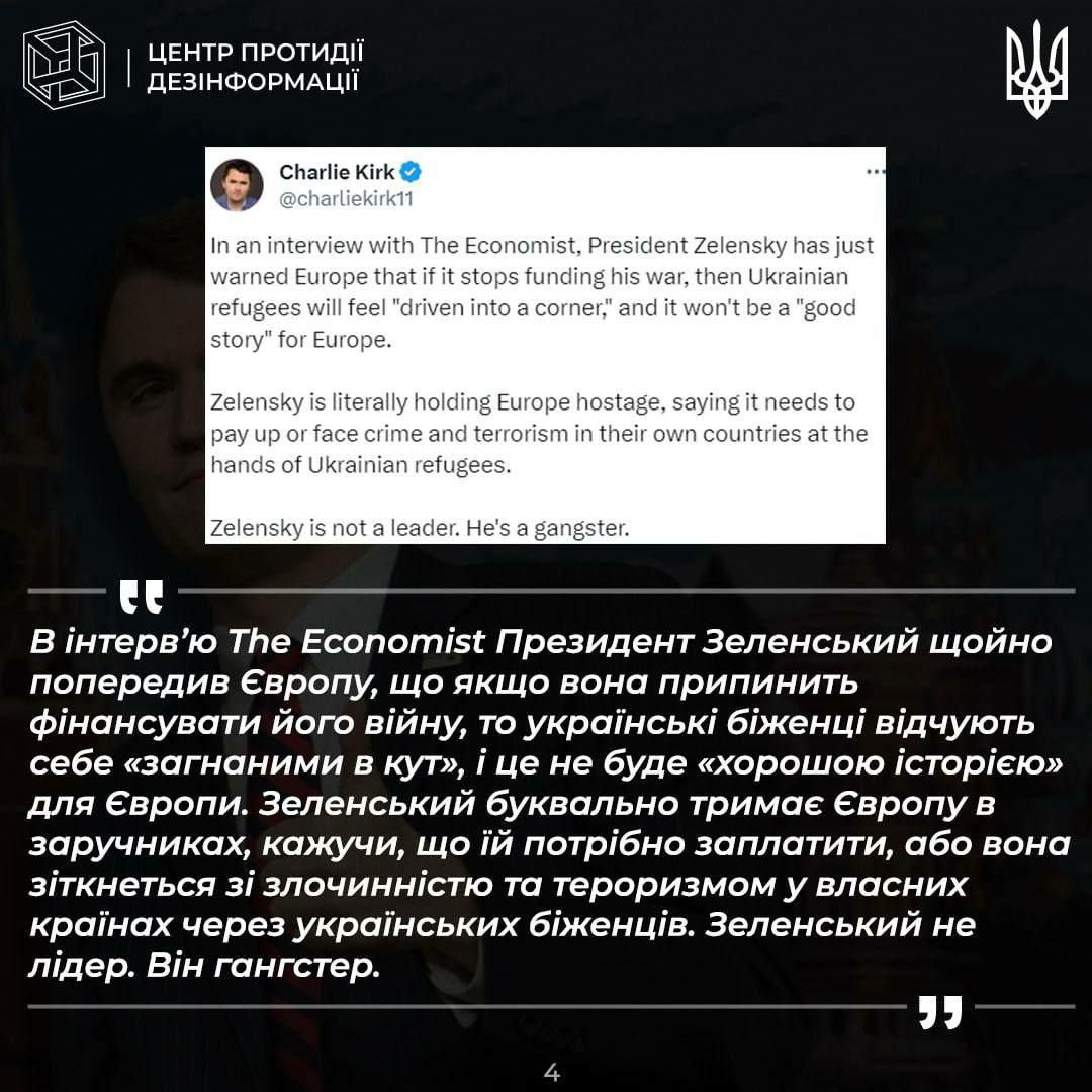 Стверджувалося, що Чарлі Кірк поширює у країнах " тези російської пропаганди ". Їхні приклади також наводить ЦПД. Там критикується, серед іншого, президент України Володимир Зеленський за те, що він "отримує чеки" в адміністрації Байдена.