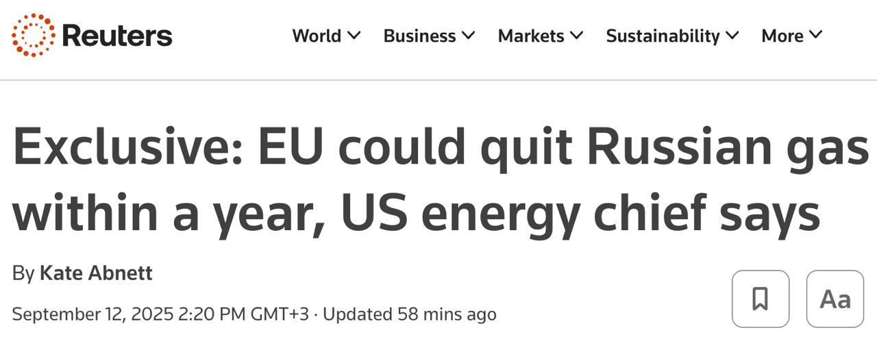 США продовжують вимагати від Євросоюзу якнайшвидше відмовитися від російського газу. Міністр енергетики країни Кріс Райт заявив, що ЄС може за півроку-рік повністю відмовитися від російського газу, замінивши його на американський зріджений природний газ.