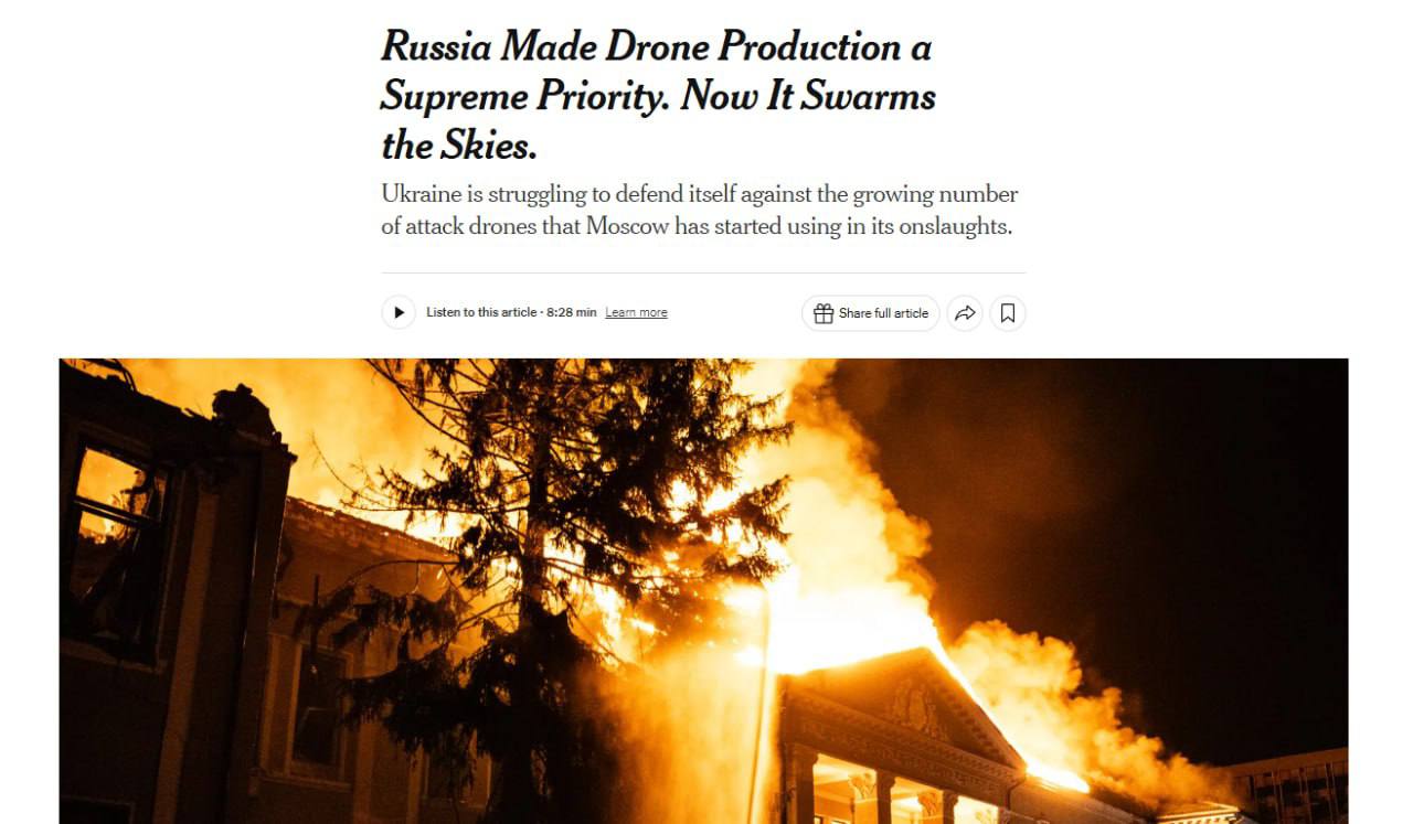 Про це йдеться у статті The New York Times, присвяченій проблемі безпілотників, які атакують Україну.