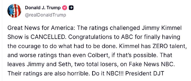 "Вітаю ABC з тим, що нарешті набралися сміливості зробити те, що повинно було бути зроблено. У Кіммела НОЛЬ таланту, і рейтинги гірші, ніж у Кольбера (звільнений раніше з телеканалу CBS комік Стівен Кольбер, теж лютий критик Трампа - Ред. ), якщо це можливо. Таким чином, залишаються Джим" Фелоном" та "Пізня ніч із Сетом Майєрсом" - Ред. ), двоє повних невдах, на фейкових новинах NBC. Їхні рейтинги також жахливі. Зроби це NBC!" - закликав президент США у своїх соцмережах.