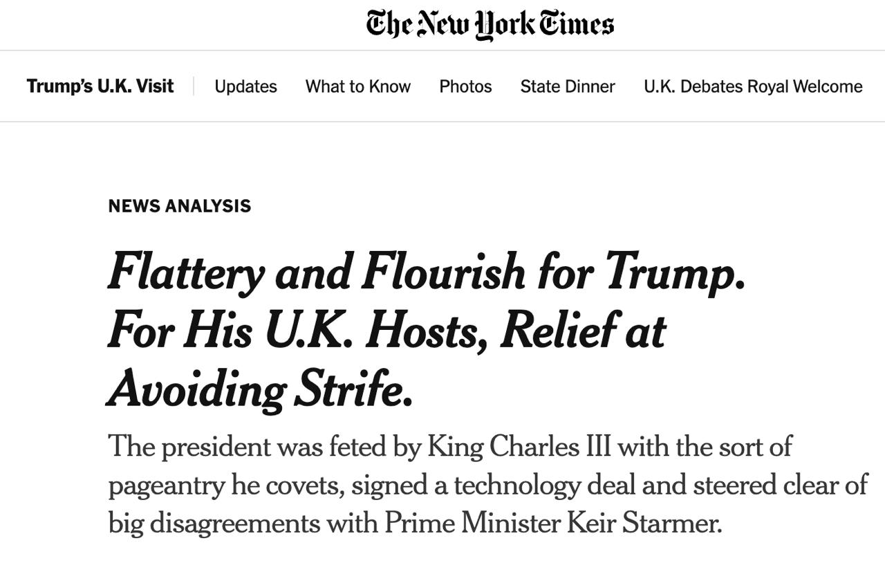 Американська The New York Times також підбила підсумки візиту і написала, що королівський прийом Трампа в Британії був потрібен "більше для того, щоб потішити президента, ніж для досягнення проривів у політиці". Але незрозуміло, чи приведе цей безпрецедентний вияв гостинності до вигод для Великобританії, зазначає видання.
