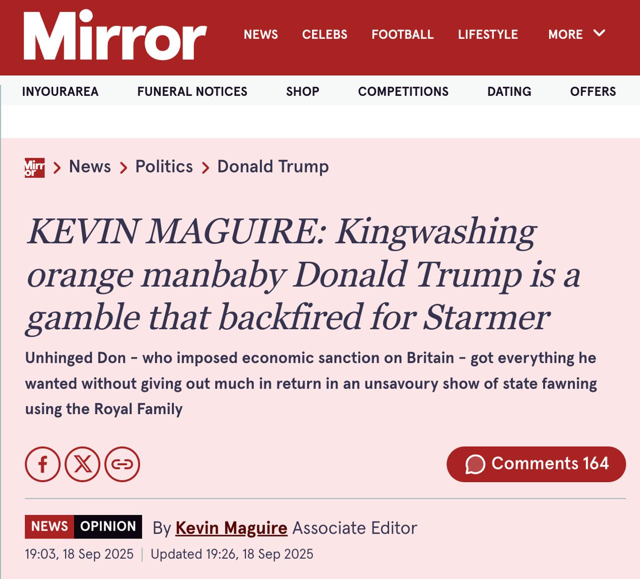 "Хоч тон був теплим, а президент не скупився на похвали Стармера, їх розбіжності — від Гази до достоїнств вітряних турбін — були очевидні. Хоча Стармер був радий почути від Трампа, що президент Володимир Путін "справді підвів його", не було жодних ознак того, що ці почуття переростуть у більш сильний. Палестинського держави є "одним з наших небагатьох розбіжностей". Трамп запропонував Стармеру "залучити військових", щоб покласти край нелегальній міграції. навмисно ухилявся від відповідей на провокаційні питання щодо свободи слова у Великій Британії, незважаючи на свої загальновідомі погляди на це питання", - пише The Times.