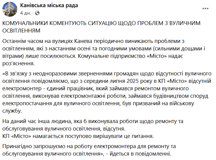 "З середини липня 2025 року в КП "Місто" відсутній електромонтер – єдиний працівник, який займався ремонтом вуличного освітлення, виконував електромонтажні роботи, займався будівництвом споруд для вуличного освітлення, був призваний на військову службу. На даний час інша людина, яка виконувала б роботи з ремонту та обслуговування вуличного освітлення, відсутня".