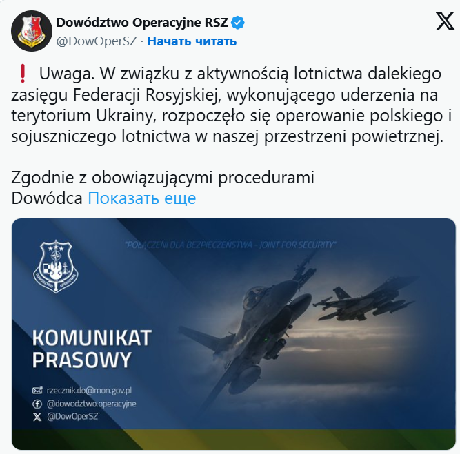 Про це повідомили у Оперативному командуванні збройних сил Польщі.